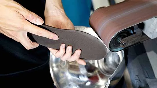 削り出されたインソールを確認しながら、最後は人の手で最終仕上げ調整を行います。